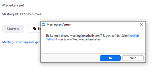 Sie haben ein regelmäßiges Online-Treffen aus dem Kalender Ihres Online-Konferenzprogrammes gelöscht. Es erscheint folgende Meldung: